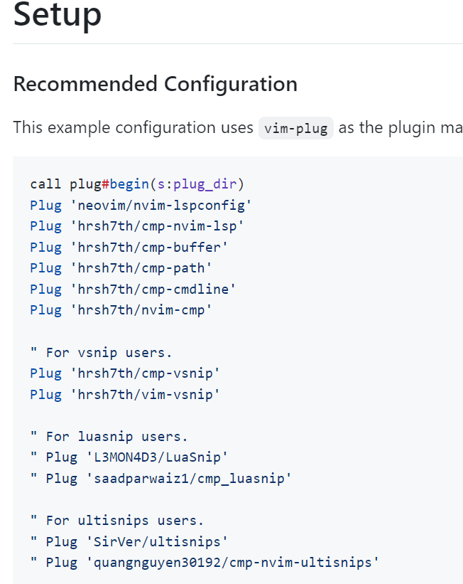 앞서 말한 coc와 ycm(youCompleteMe) 대신 nvim-cmp를 고른 이유가 있습니다. coc는 node를 깔아주어야 하고 youCompleteMe는 python관련 의존성이 있는 것으로 보였습니다. 대신 nvim-cmp는 lsp를 쓴다고 해서 좀더 표준화 된 플러그인 이라는 생각이 들어서 입니다. 그리고 레딧같은데 검색 해보면 nvim-cmp가 대세라고 해서 처음 세팅 하니까 coc, ycm대신 nvim-cmp를 쓰기로 했습니다.