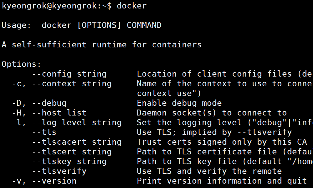 설치가 완료된 후 docker라고 입력 했을 때 위와 같이 나오면 잘 설치 된 것입니다.