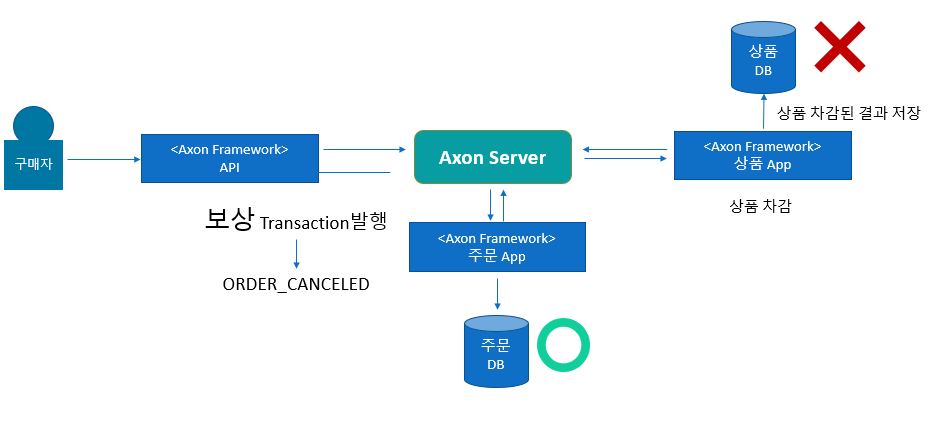 마이크로서비스간 이벤트를 주고 받아 특정 마이크로서비스에서 작업이 실패하면, 이전까지의 작업이 완료된 마이크로서비스에 보상(Compensating) 이벤트를 발행함으로써 원자성(atomicity)을 보장하는 패턴 입니다.