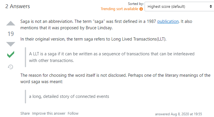추측하기로는 Long Lived Transaction이 마치 중세 아이슬란드 문학의 산문과 '말해진 것, 말로 전하다' 라는 뜻의 '사가'(Saga)에서 온것 같다고 스택오버플로우 답변자가 말합니다.