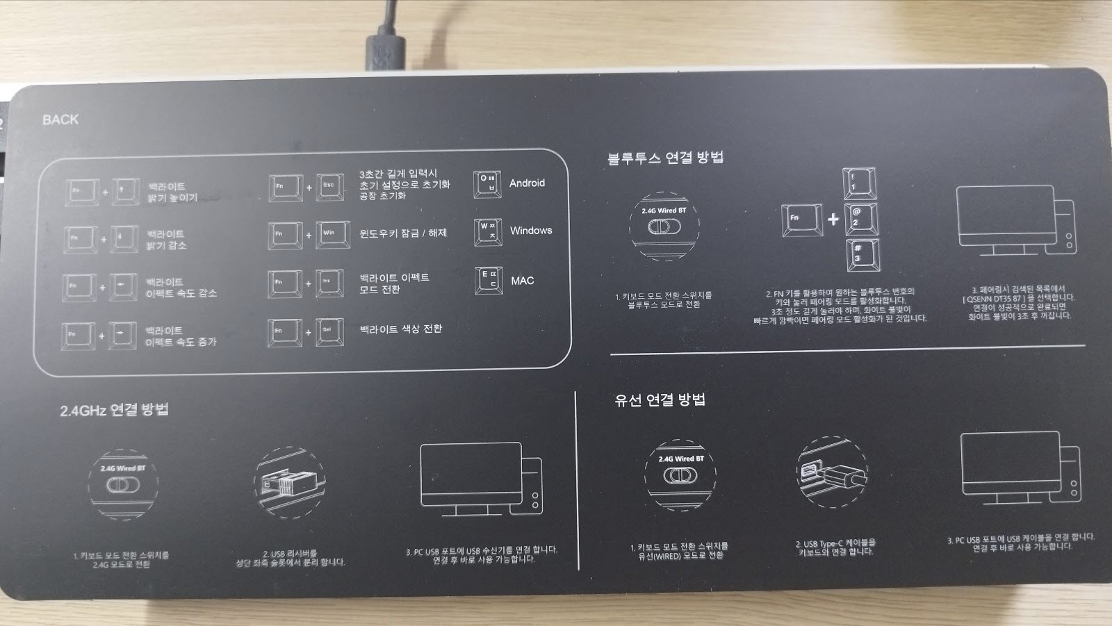 개인적으로 독거미 키보드의 ABS키캡에 적응이 되어 있어서 그런지 ABS가 더 마음에 들었어서 이 키보드를 처음 받았을 때는 조금 실망 했습니다. 제품명에 PBT라고 써있는데 메뉴얼에는 PBT가 뭔지 언급도 없어서 인터넷 검색 해보니 PBT가 ABS보다는 더 좋은 거라고 설명이 되어 있었습니다. 관계자분께서 보신다면 PBT 키캡에 대한 자랑좀 메뉴얼에 써주시면 더 좋지 않을까 싶네요.