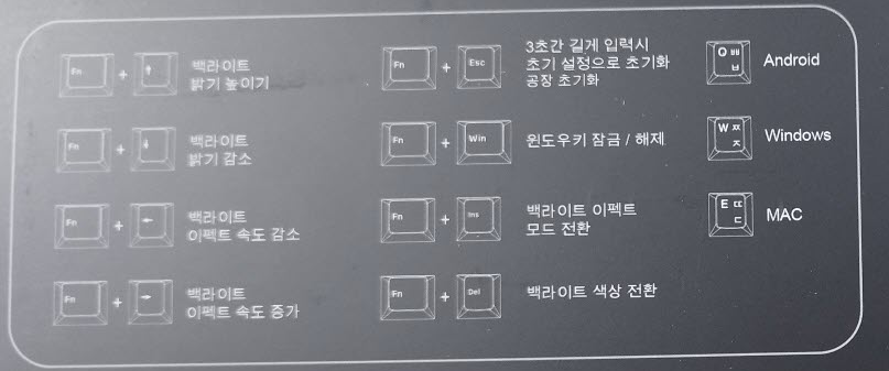 사진이 좀 안나왔는데 fn + Insert, fn + Delete 로는 LED모드 전환이고 fn + 위, fn + 아래로, 좌, 우로 led 밝기, 속도 등을 조정 할 수 있습니다.