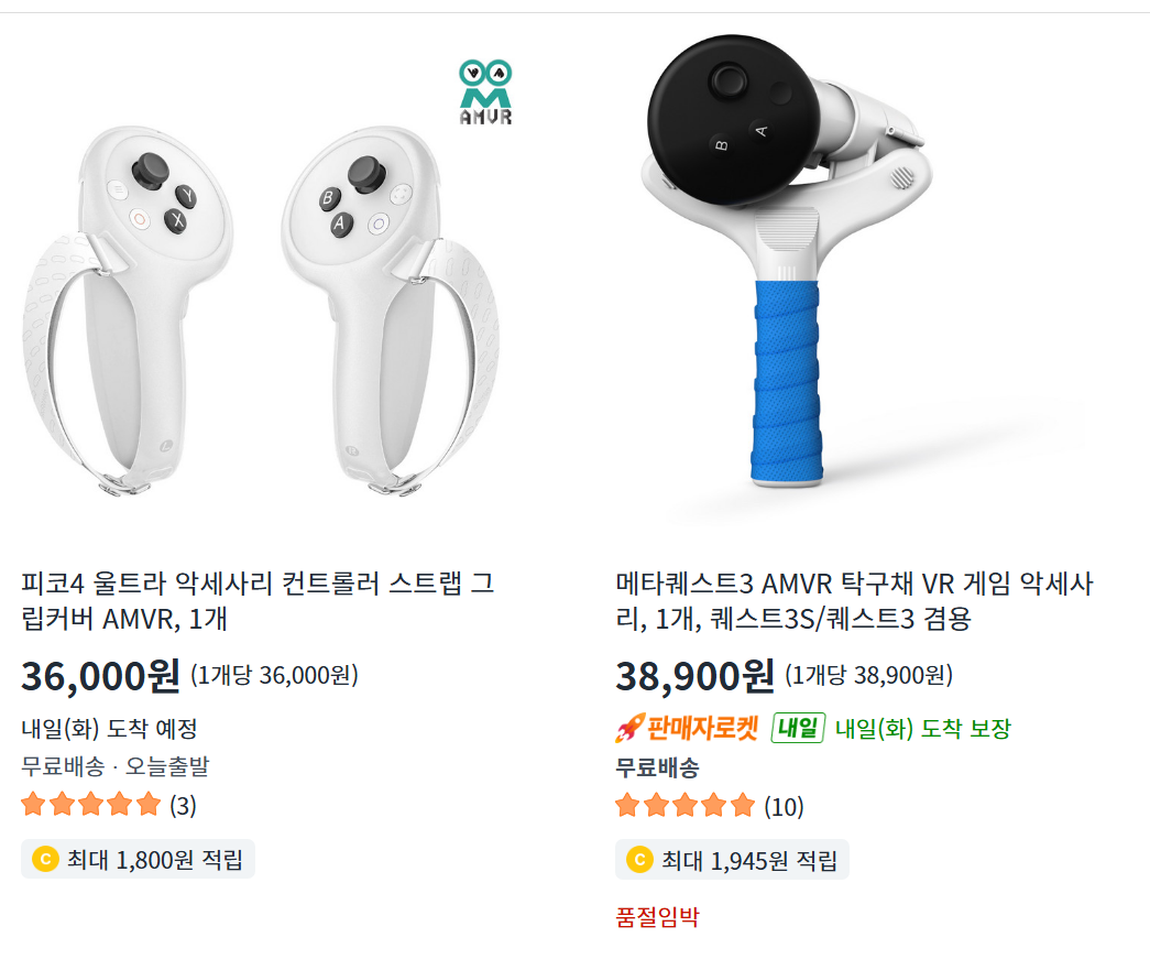 VR은 왼쪽과 같은 컨트롤러를 들고 해야 하는데 탁구채 같은 어댑터가 있습니다. 이걸 쓰면 오른쪽 처럼 탁구채 처럼 쥐고 칠 수 있습니다. 저도 구매 해볼 예정입니다.